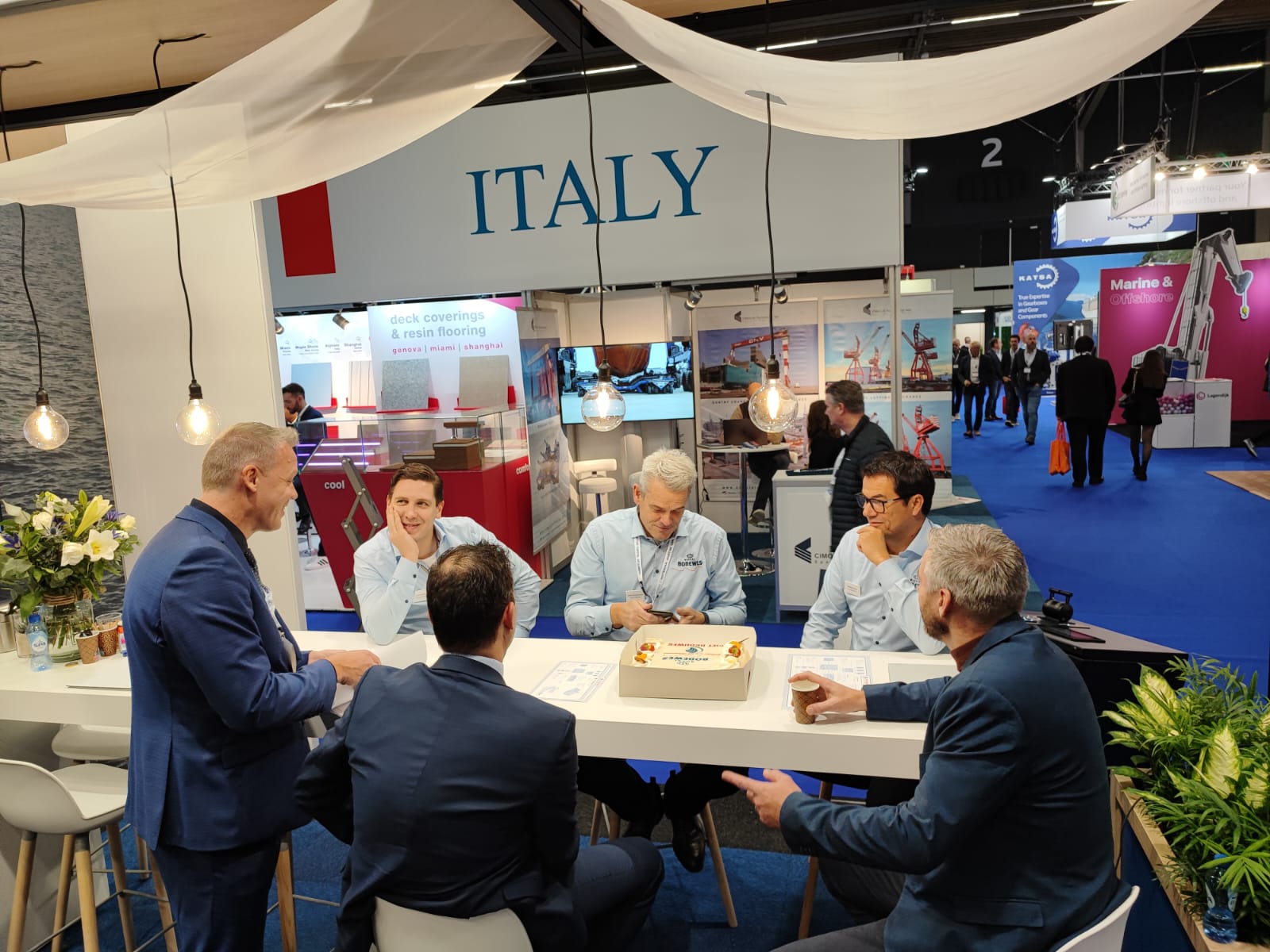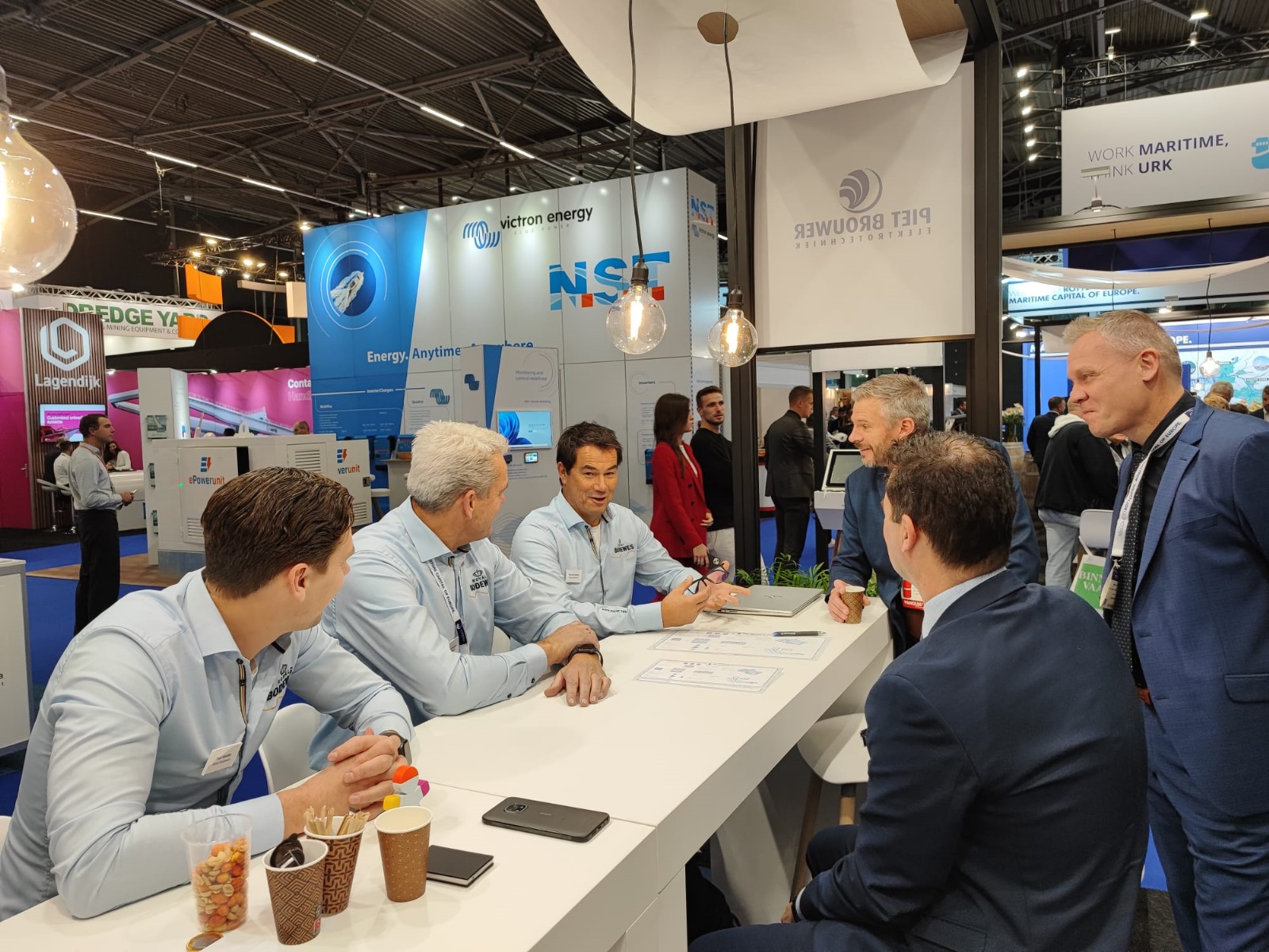 Op de foto de feestelijke ondertekening op de stand van Piet Brouwer Elektrotechniek (2407) op het Urk Maritime Paviljoen.